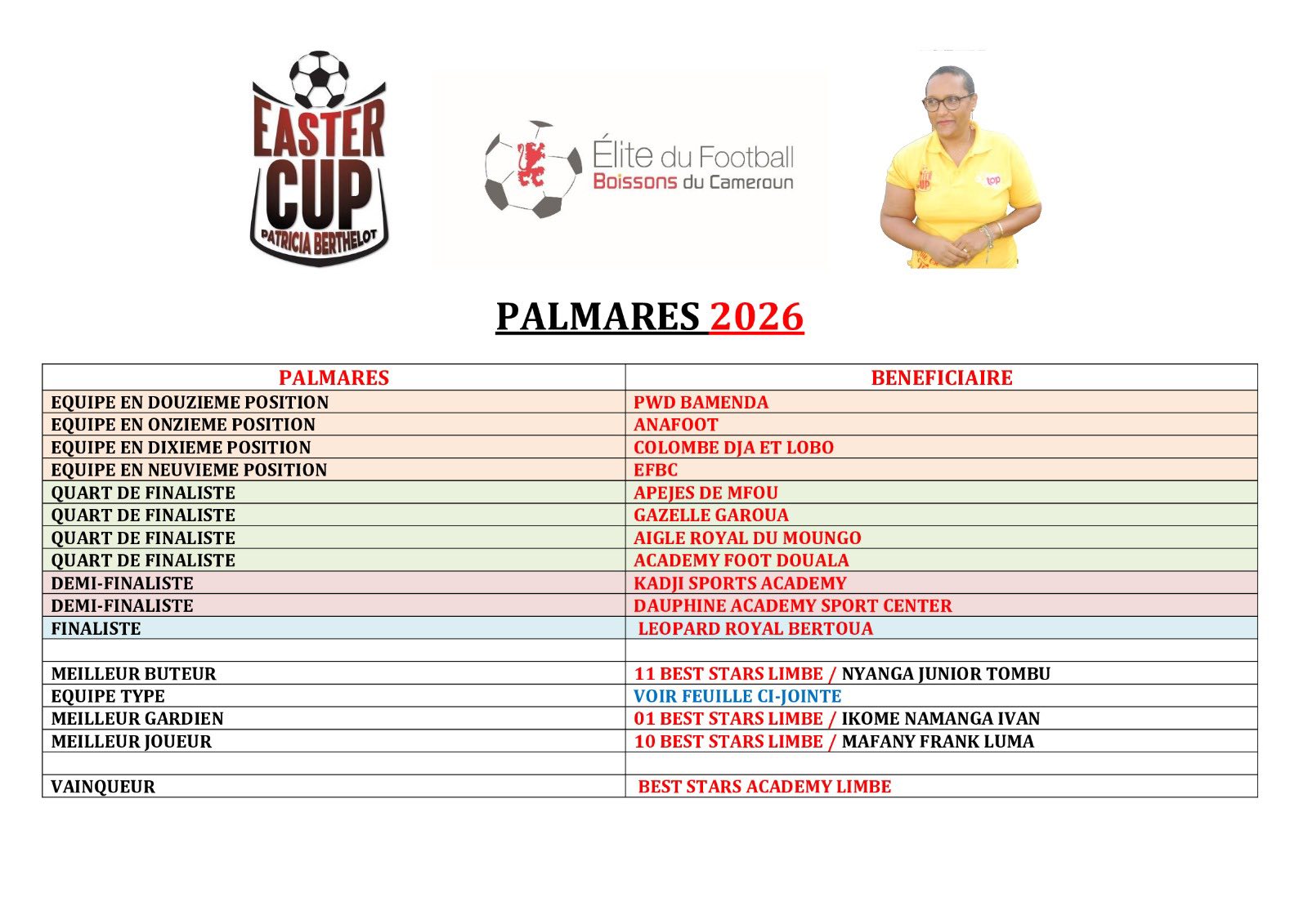 « C’est un trophée que nous avons cherché depuis longtemps. Mais aujourd’hui, je peux dire que Dieu nous l’a donné. Nous sommes très contents. Cette victoire est le fruit du travail acharné. Nous avons beaucoup travaillé. Nous avons gagné beaucoup de choses grâce à ce travail ». C’est un Saturnin Djoufack soulagé et comblé qui parle à la presse ce 18 Avril au Stade de La Réunification, à Douala. L’entraineur de Best Stars de Limbe vient de conduire son équipe au sacre à la 11ème édition de la Easter Cup Patricia Berthelot (0-0 à l’issue du temps réglementaire puis 4-1 après tirs au but).