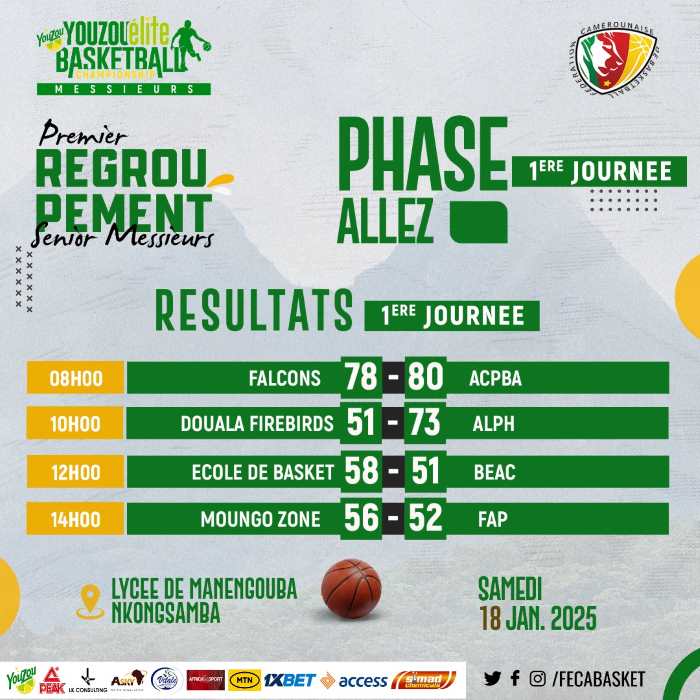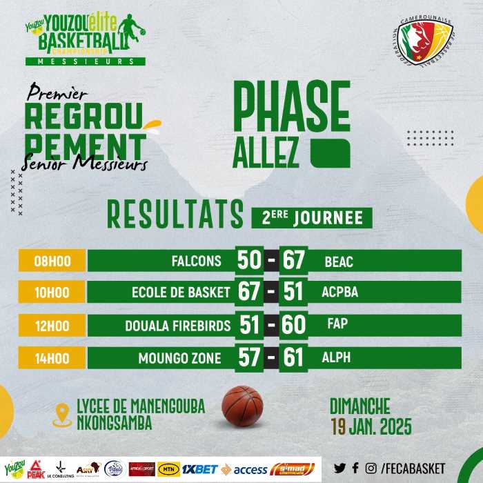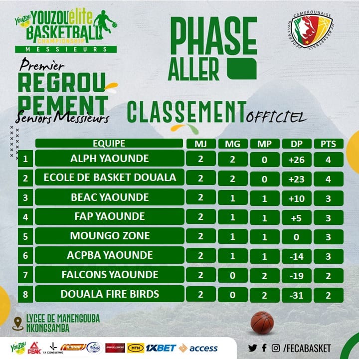 Ecole de basket de Douala et Alph de Yaoundé sont les deux grands vainqueurs de cette première phase. Ce sont les seules formations qui totalisent deux victoires en autant de sorties. Lors de la première journée, Ecole de Basket a battu BEAC de Yaoundé par 58 points à 51. Sa seconde victime est ACPBA de Yaoundé. Cette équipe a lourdement chuté 51 contre 67. Alph pour sa part a d’abord triomphé de Douala Firebirds (73-51) avant de confirmer ses bonnes dispositions devant la surprise Moungo Zone, battue d’une courte tête (61 -57).