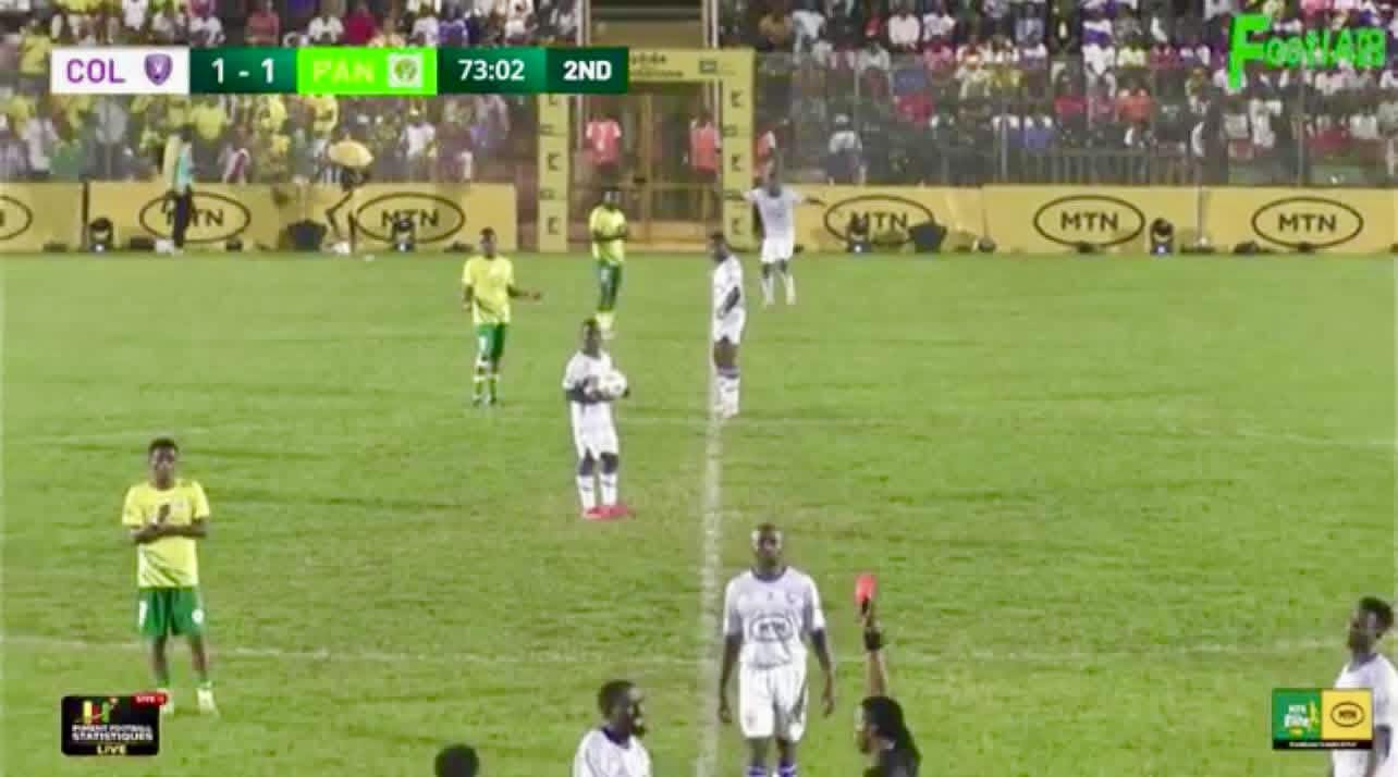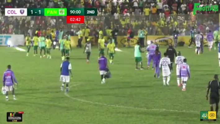 Ensuite après leur retour sur le terrain, Les joueurs assistent à l’exécution du penalty qui permet à leur adversaire de les rattraper au score (1-1). Colombe proteste de nouveau après m‘inscription du but. L’équipe quitte de nouveau l’aire de jeu pour ne plus y revenir. Elle s’insurge cette fois-ci contre l’expulsion de son capitaine Randy Ntuwe Kwalar. L’arbitre Biel Kolondo laisse s’écouler les 20 minutes qui restent à jouer dans le temps réglementaire. Il siffle ensuite la fin de la partie. Panthère Sportive du Ndé pourrait être déclaré vainqueur. Colombe pour sa part risque des sanctions.