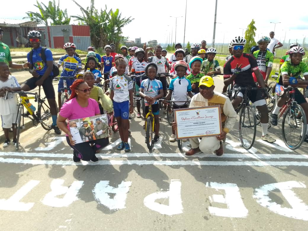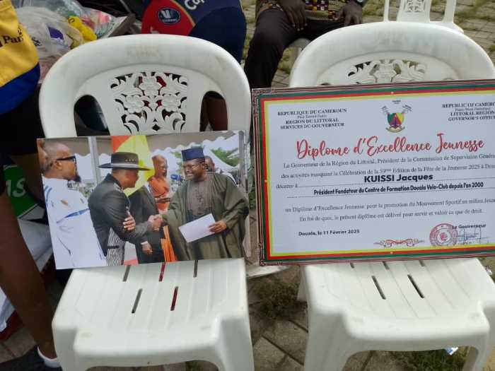 C’est un dimanche pas comme les autres pour Jacques Kuissi. Le dirigeant sportif assiste à l’hommage qu’un jeune collègue et des parents d’enfants inscrits dans son club Douala Vélo Club, lui rendent ici en face du complexe sportif de Japoma. Le jeune collègue en question est Christian Tiyack. C’est le promoteur de Phoenix Vélo Club de Douala, une formation cycliste lancée depuis quelques années. Il veut « arroser » le « diplôme d’excellence jeunesse » décerné à l’ancien président de la Ligue de cyclisme du Littoral. C’est le gouverneur de la région du Littoral qui lui remet cette distinction le 11 Février 2025. L’autorité le fait lors de la célébration de la 59ème fête de la jeunesse à Douala.